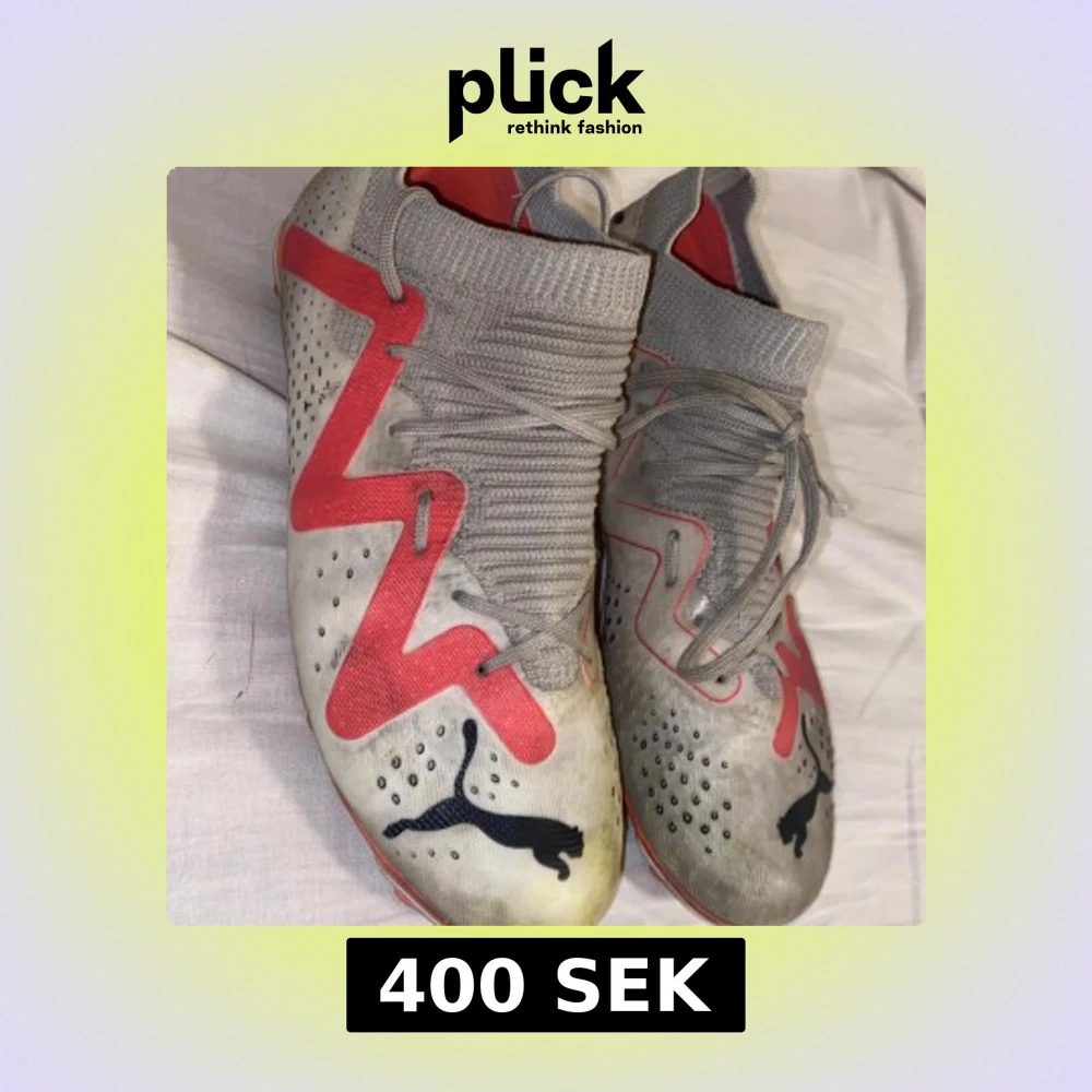 Säljer ett par gråa fotbollsskor från Puma med röda och svarta detaljer. Skorna har stickad strumpliknande öppning, snörning och perforerade partier för ventilation. Puma-logga på tån och sidan. Perfekta för dig som vill sticka ut på planen.