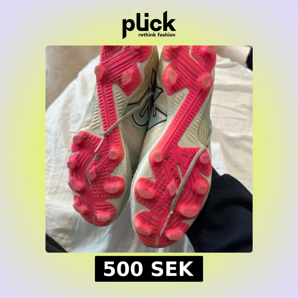 Säljer ett par använda Puma Future 7 Ultimate fotbollsskor. Skorna har tydligt bruksslitage, främst framtill och under sulan (se bilder), men är fortfarande fullt användbara för träning eller match. • Modell: Puma Future 7 Ultimate FG/AG • Storlek: 44 • Skick: Använda, synligt smutsiga och lätt slitna, men inga hål eller trasiga delar • Färg: Vit/rosa/svart • Passar för: Naturgräs och konstgräs Perfekt för dig som vill ha en toppmodell till ett bättre pris. Pris: [500]