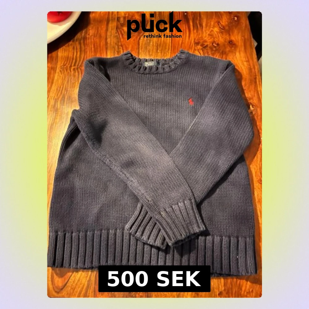 Säljer en mörkblå stickad tröja från Polo Ralph Lauren med klassisk röd broderad logga på bröstet. Tröjan har rund halsringning, ribbade muddar och nederkant samt långa ärmar. Perfekt för lager-på-lager under hösten och vintern.
