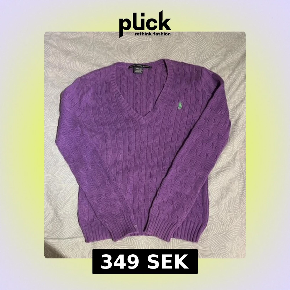 Säljer en lila kabelstickad tröja från Ralph Lauren med v-ringad hals och långärmad design. Tröjan har ett grönt broderat logotyp på bröstet och ribbade muddar vid ärmslut och nederkant. Perfekt för dig som gillar klassisk stil med färg.