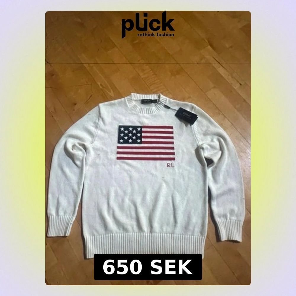 Vit stickad tröja från Polo Ralph Lauren med amerikansk flagga broderad på bröstet och RL-broderi. Tröjan har rund halsringning och ribbstickade muddar vid ärmslut och nederkant. Perfekt för dig som gillar klassisk och stilren design. Storlek L men passar mer som M