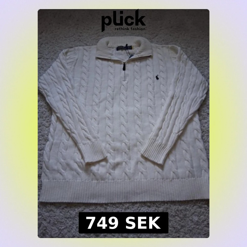 Kabelstickad vit tröja från Polo Ralph Lauren med halv dragkedja och klassisk broderad logga på bröstet. Tröjan har ribbade muddar och krage, perfekt för lager på lager och en clean look.