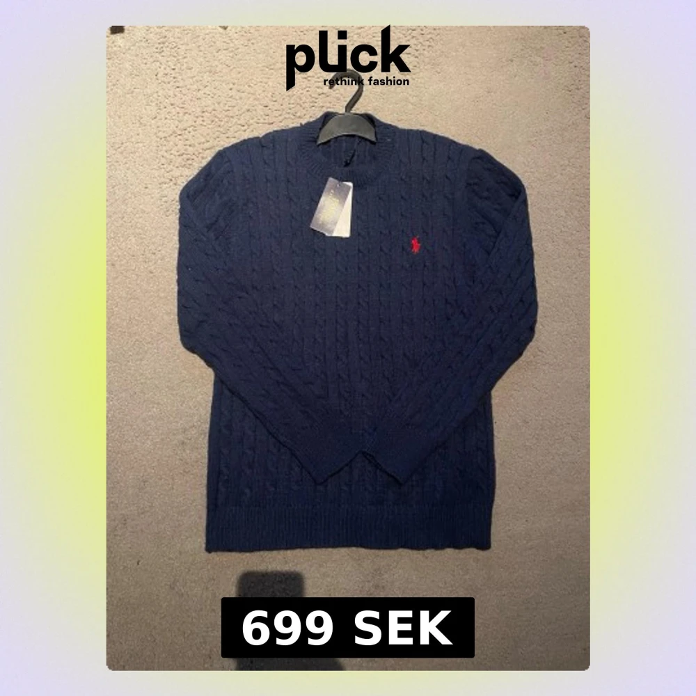 Mörkblå kabelstickad tröja från Polo Ralph Lauren med rund halsringning och röd broderad logga på bröstet. Tröjan har långa ärmar och ribbade muddar vid ärmslut och nederkant. Perfekt för en stilren och klassisk look.