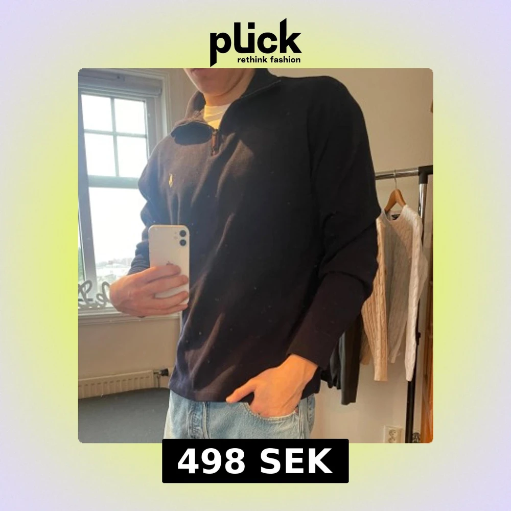 Säljer en marinblå långärmad tröja från Polo Ralph Lauren med half zip och klassisk broderad logga på bröstet. Tröjan är i mjuk bomull och har en stilren, normal passform som funkar till jeans eller chinos.