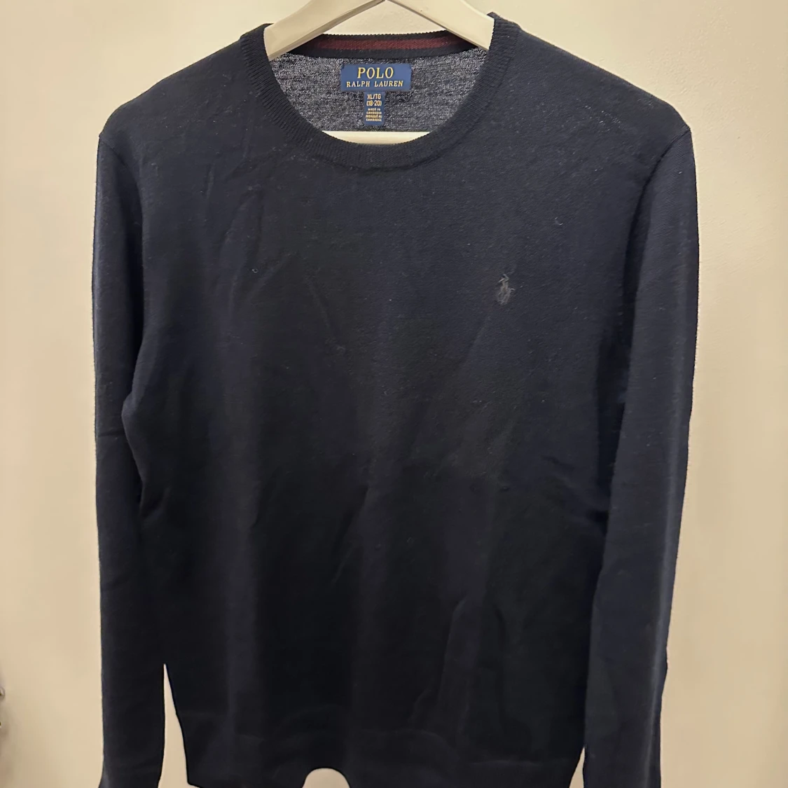 Snygg mörkblå tröja från Polo Ralph Lauren i storlek S. Tillverkad i 100% ull med klassisk rund hals och diskret broderad logga på bröstet. Perfekt för dig som gillar stilrena och tidlösa plagg med premiumkänsla. Passar som S, XL i barnstorlek.