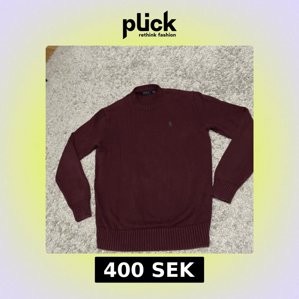 Säljer en vinröd stickad tröja från Polo Ralph Lauren i storlek XS. Tröjan har rund halsringning, ribbade muddar och det klassiska gröna broderade logot på bröstet. Perfekt för dig som gillar stilrena och tidlösa plagg.
