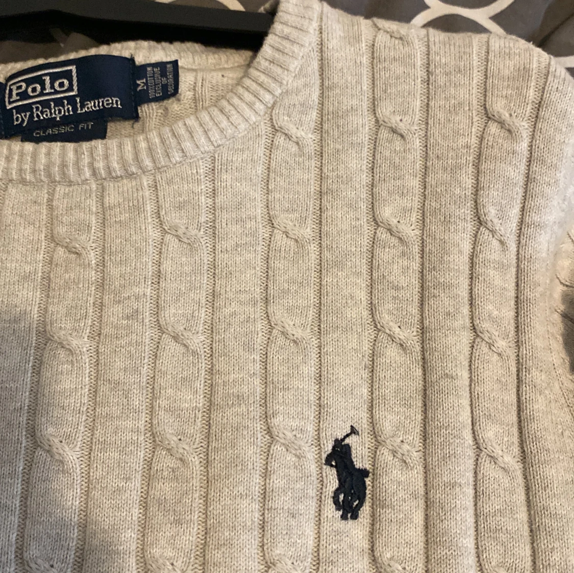 Långärmad stickad polo tröja. Skick 9/10 och storlek S men passar mer XS. Har ett lite hål i armhålan.