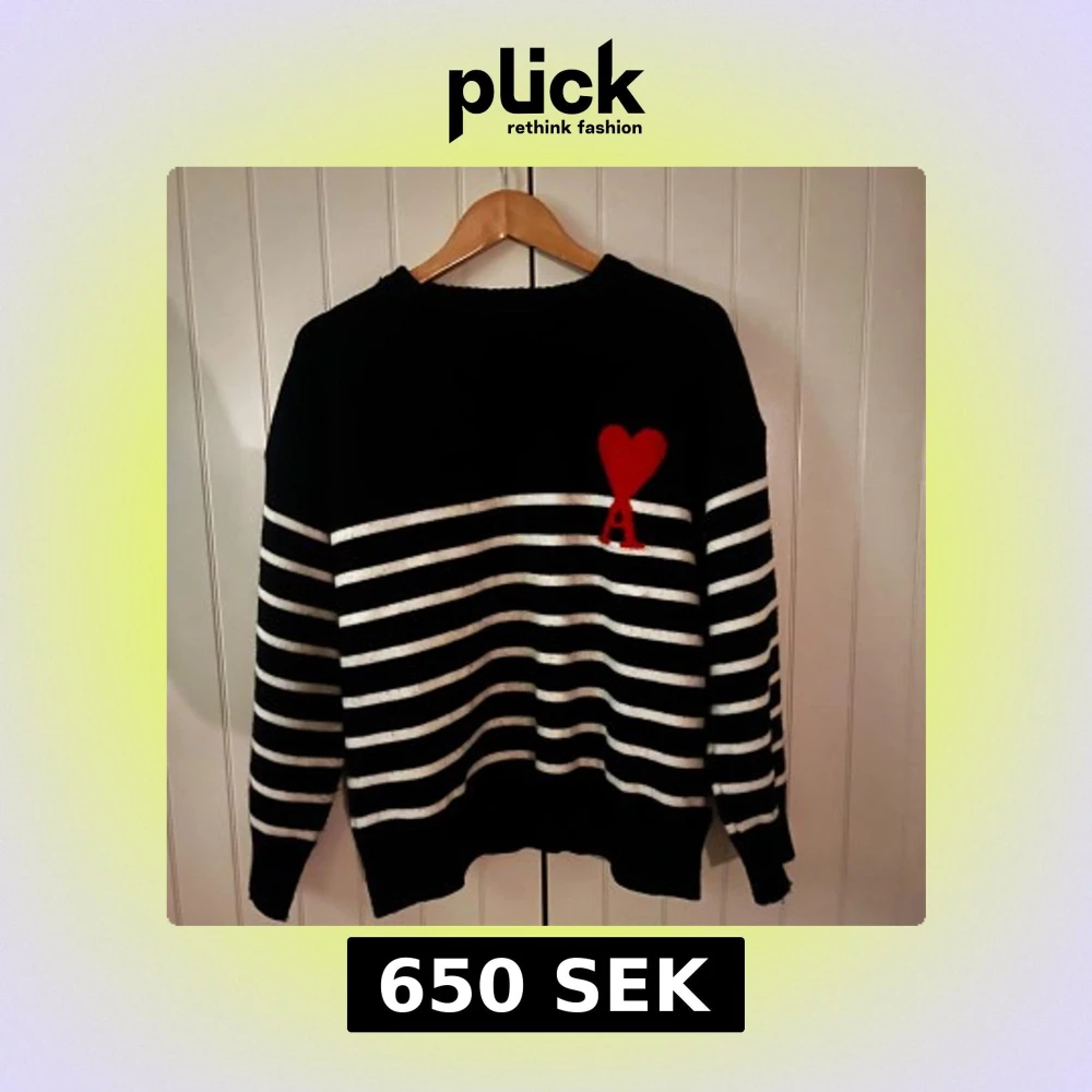 Mörkblå stickad tröja från Ami med vita horisontella ränder och en röd hjärtapplikation med bokstaven A på bröstet. Tröjan har långärmad passform och är tillverkad i mjukt stickat material. Perfekt för dig som gillar stilrena detaljer med en twist. Tröjan ser svart ut men den är egentligen en väldigt mörk mörkblå