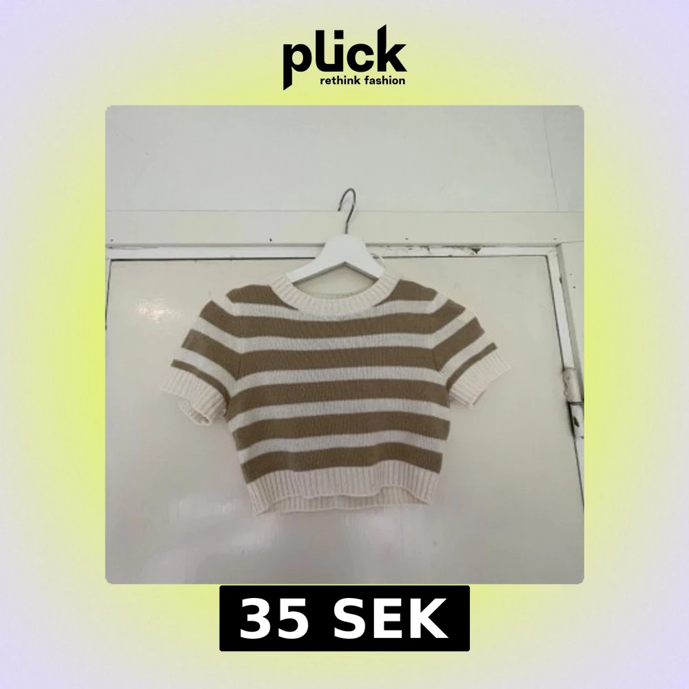 Superfin croppad stickad topp med breda beige och vita ränder. Kortärmad modell med ribbade kanter vid ärmslut, halsringning och nederkant. Perfekt för dig som gillar en chill och trendig stil.