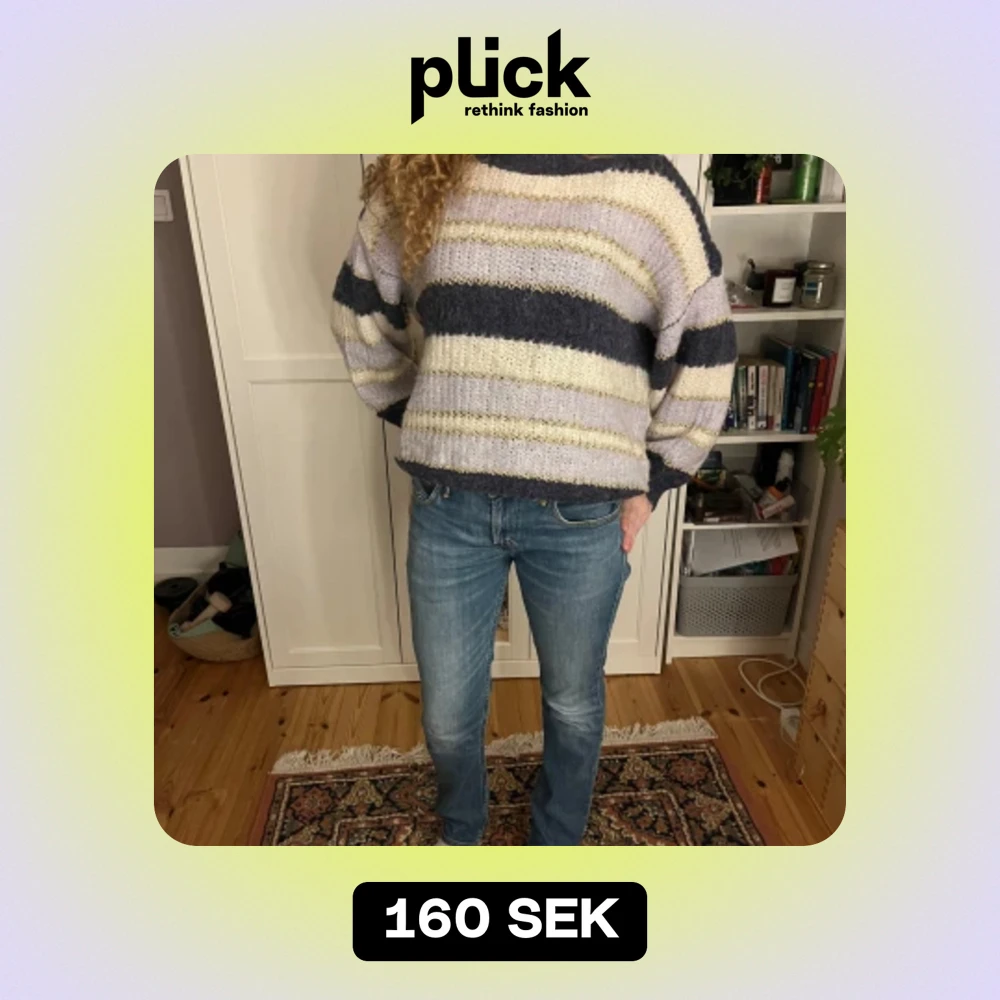Jätte söt stickad tröja, köpt från Sellpy. Syrenlila, mörkblå, cremevit och guld glittrig.
