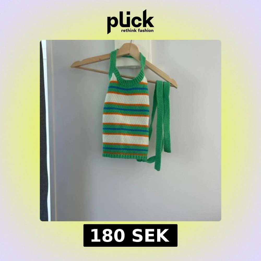 Säljer en färgglad randig stickad topp från Zara i grönt, vitt, orange och blått. Toppen har en halterneck-design med knytband och är ärmlös. Perfekt för sommarn