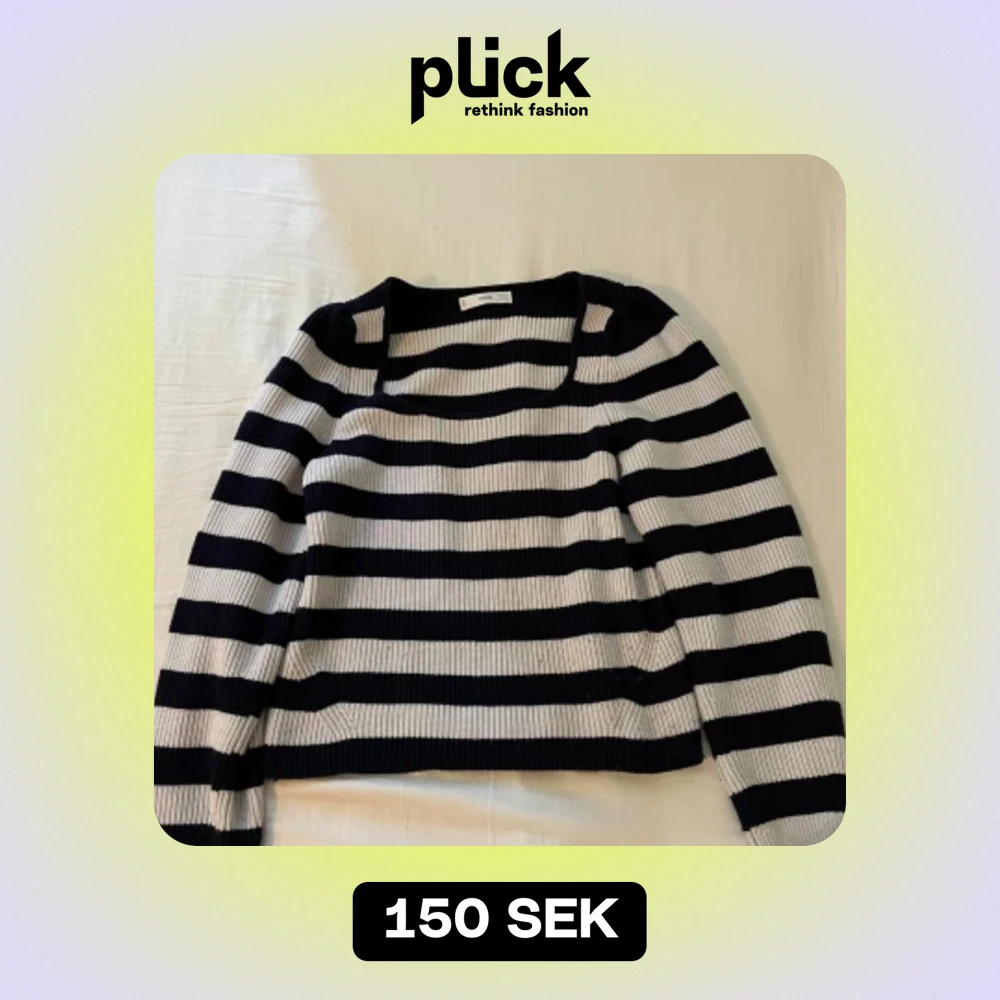 Säljer en superfin randig tröja från MNG i en mörkblå och vit färg. Den är stickad och har en skön, ribbad. Tröjan är i storlek M.