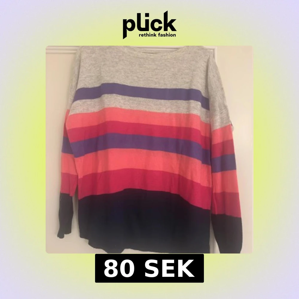 Säljer en stickad tröja från Oasis i storlek M med breda ränder i grått, lila, rosa, rött och mörkblått. Tröjan har rund hals och långa ärmar, perfekt för dig som gillar färg och vill ha en chill vibe. Supermjuk och skön att bära.