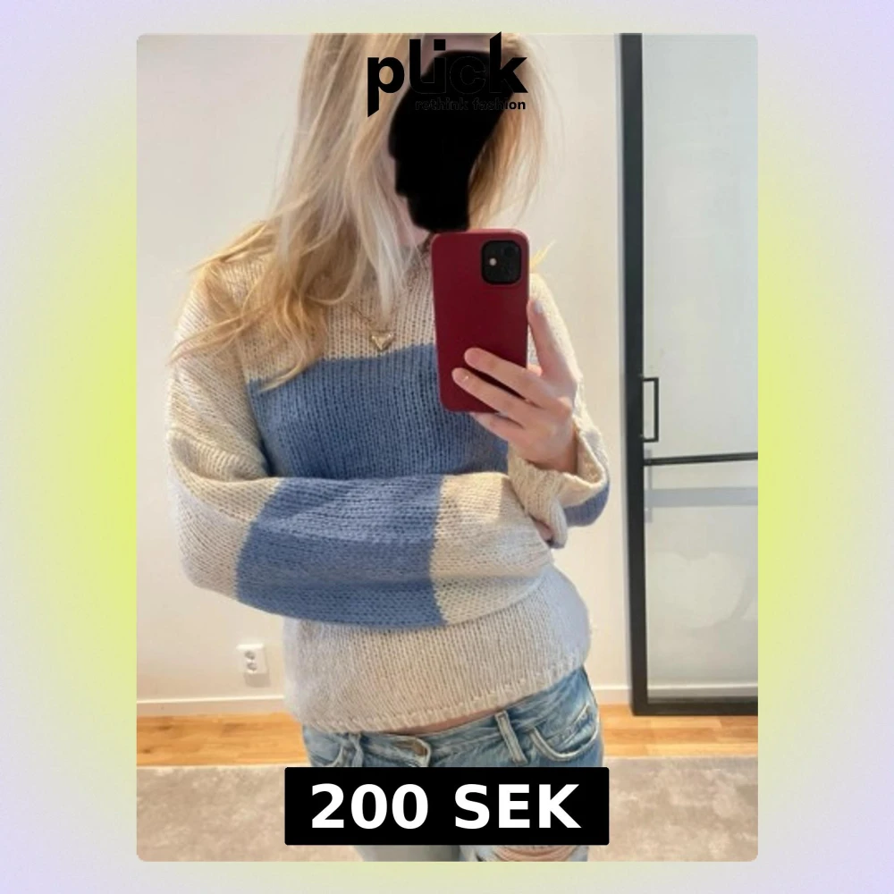 Säljer en mysig stickad tröja med breda ränder i ljusblått och vitt. Tröjan har en relaxed passform, rund hals och långa ärmar. Från KIABI storlek S, superbra skick.