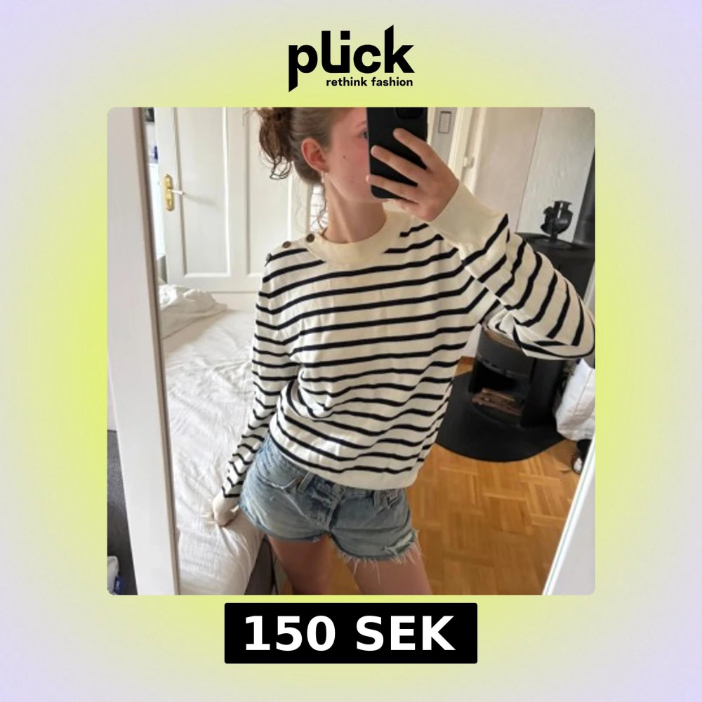 Randig stickad tröja med knapar på ena axeln, tröjan är använd men i fint skick.