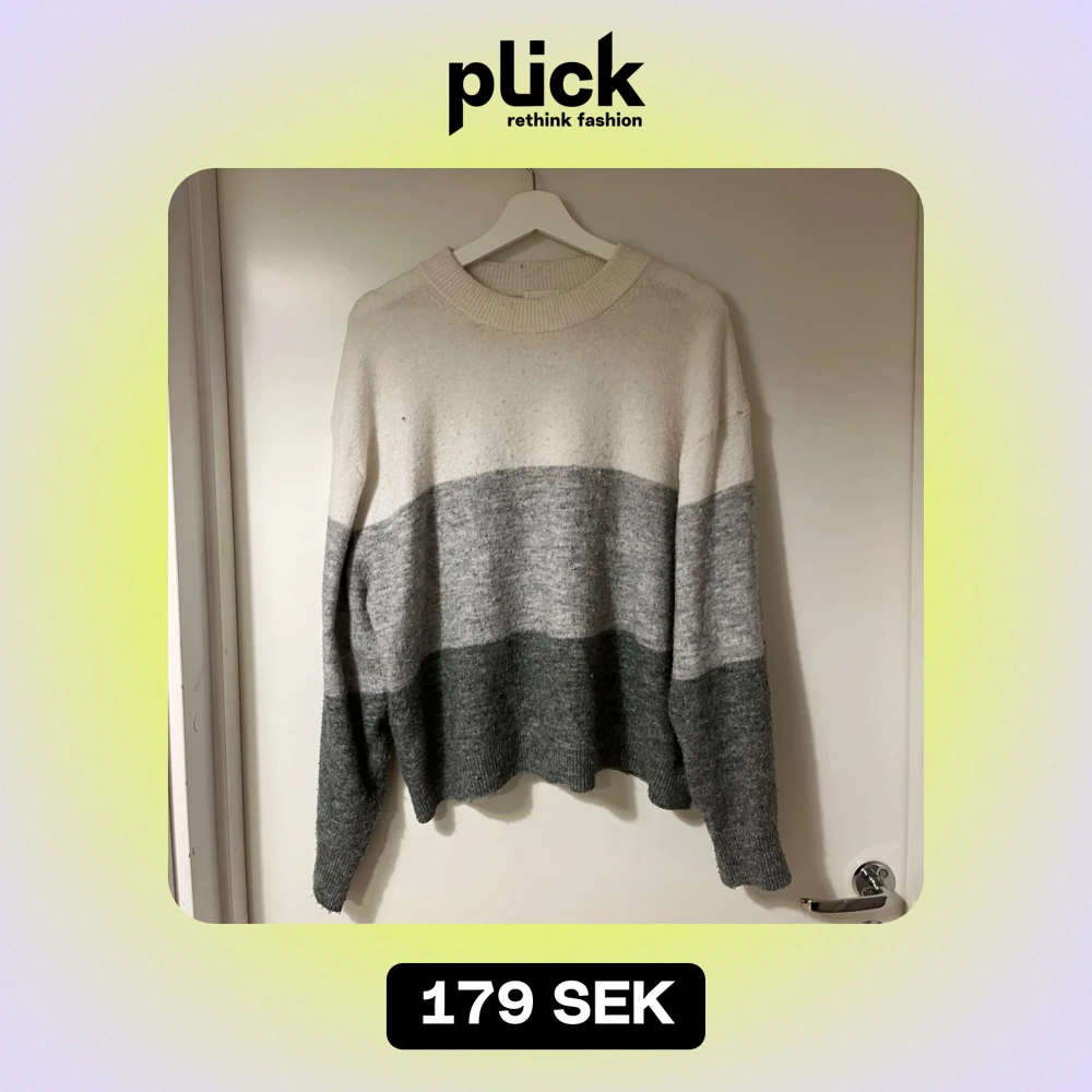 Säljer en mysig randig tröja från H&M i beige och grå toner.