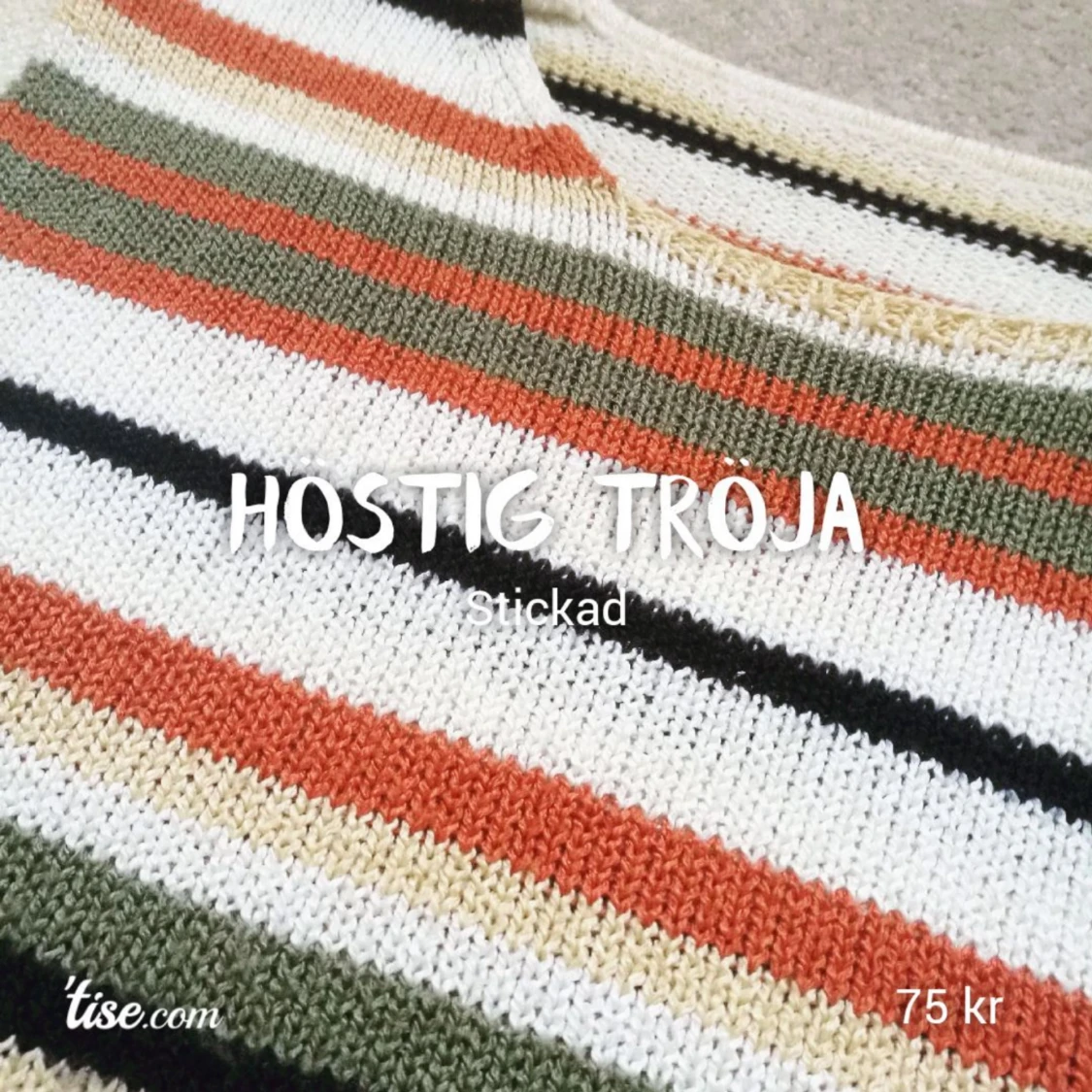 Stickad tröja med höstiga färger. Lite smånopprig på vissa ställen annars i bra skick. Den har lös pasform på mig, mina mått är Bröst 95 Midja 75 Höft 87 Bor du i norrköping kan vi mötas upp!😊