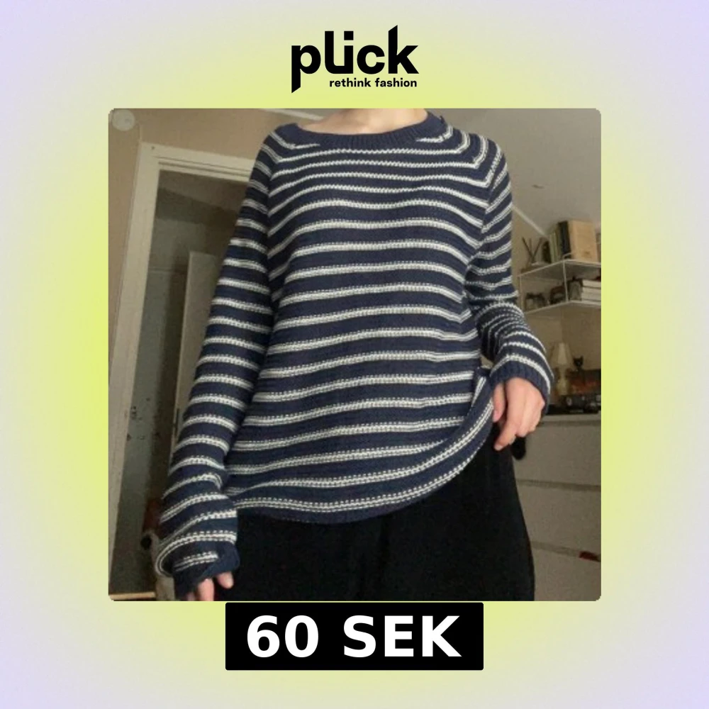 Säljer en blå stickad tröja med vita ränder från H&M i storlek M. Tröjan har rund halsringning och långa ärmar. Perfekt för kyligare dagar och enkel att matcha med jeans eller kjol. Små defekter i vänster armhåla samt kragen. Se bilder 4 & 5.