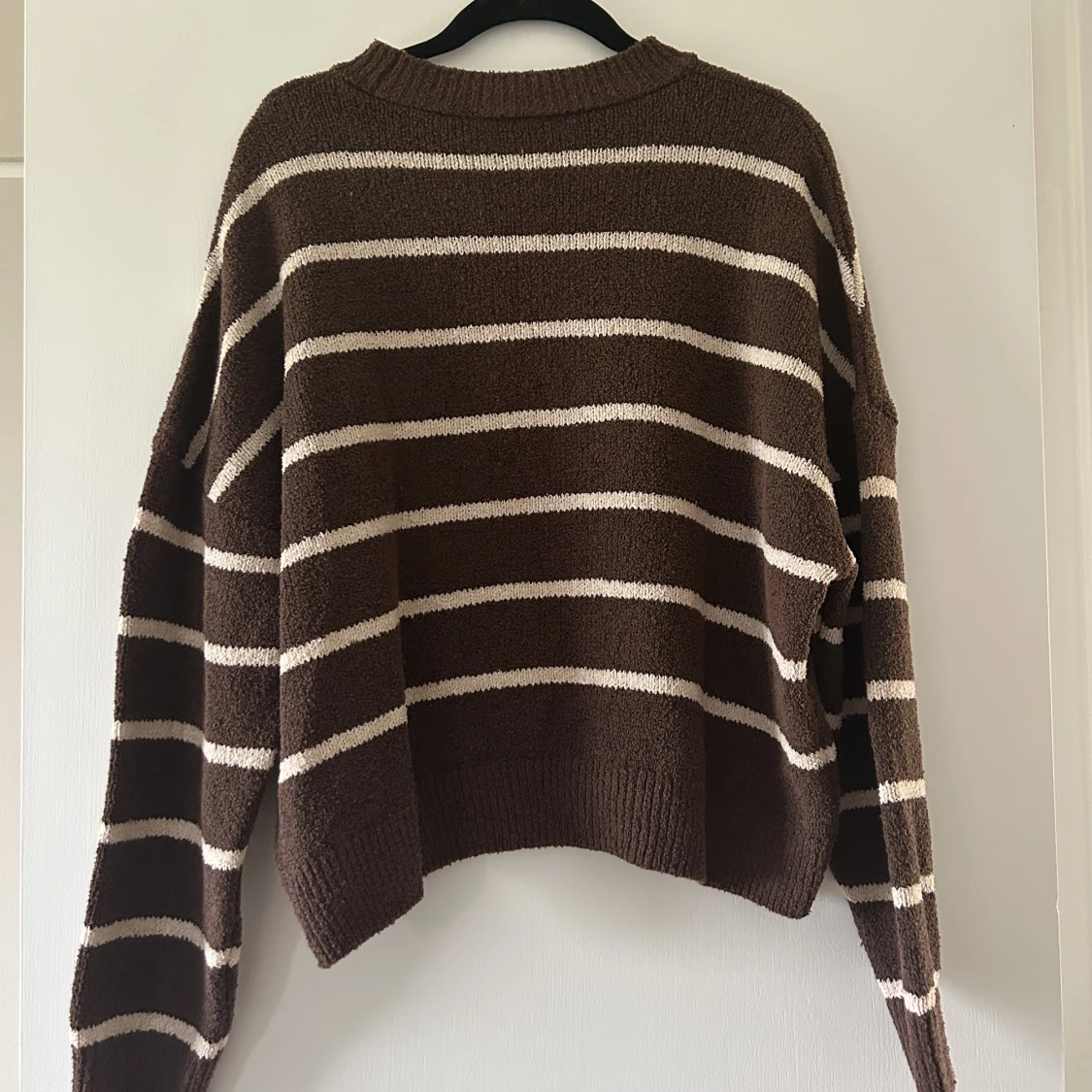 Stickad tröja i handuksmaterial som är brun med beiga ränder. Tröjan är lite kortare i modellen men inte croppad riktigt. Är från NA-KD och är i storlek XS. Knappt använd endas få gånger.