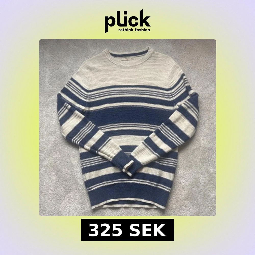 Snygg stickad tröja från Mango i storlek M. Tröjan har ett randigt mönster i blått och beige. Bara att medela för om du har frågor 🤝