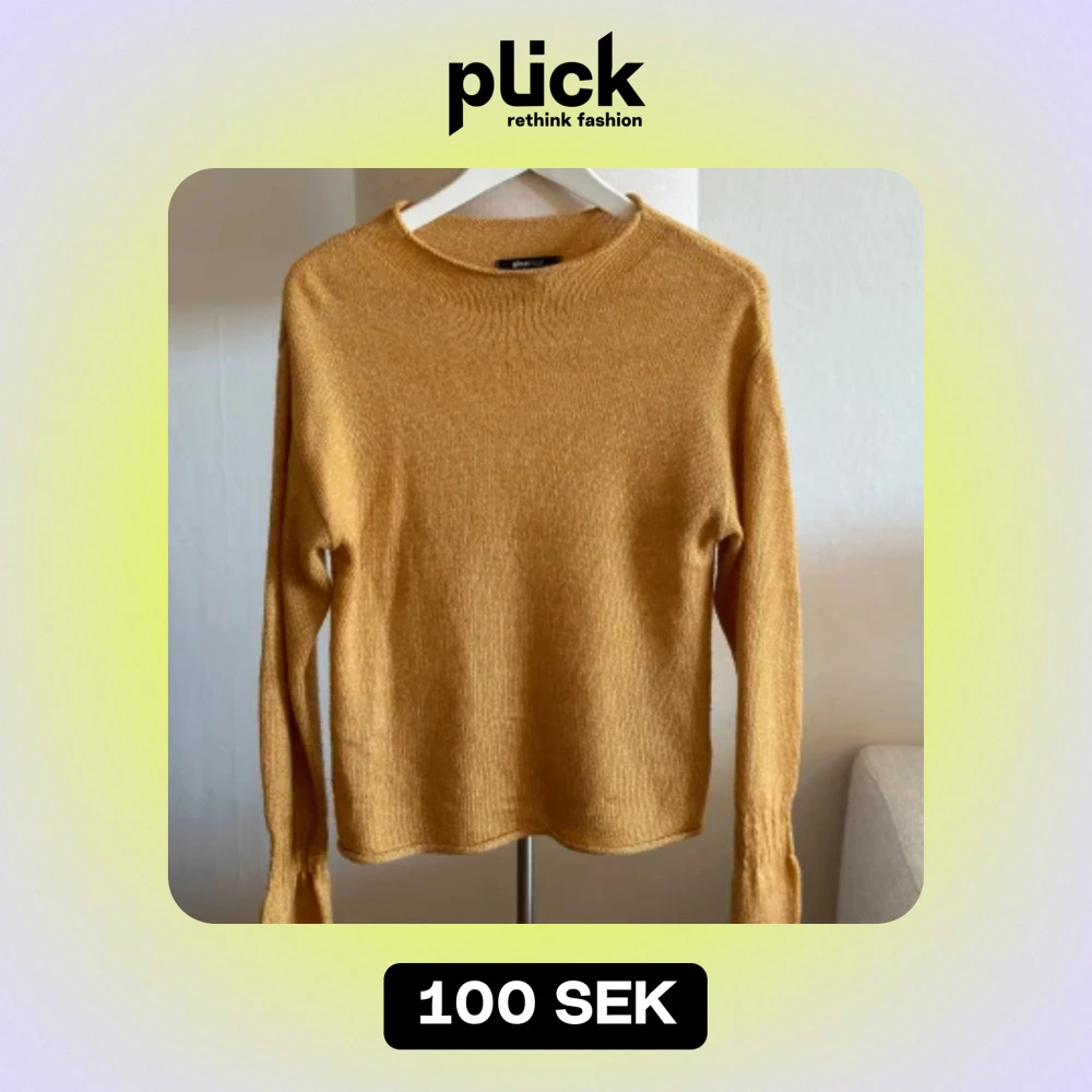 Stickad tröja i en snygg gul färg blandat med vit. Snygg detalj i armen, sitter åt runt handleden och går över handen.