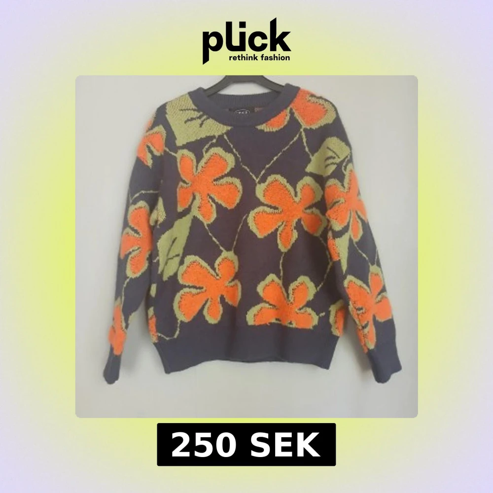 Flower power i stickad form – unik 70-talsretro som värmer & väcker uppmärksamhet! Direkt från flower power-erans färgstarka garderober! Den här stickade tröjan från Cider är som hämtad ur ett 70-talsmode-magasin – med stora orangea blomblad och frodiga gröna blad på en djup marinblå botten. Ett statement-plagg som för tankarna till varma höstdagar, skivspelare som snurrar och doften av nybryggt kaffe i ett bohemiskt kök. Storlek: S Skick: fint skick Stil: 70-tal, boho, flower power, retro