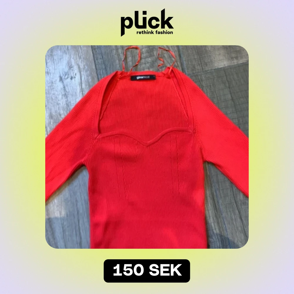 Röd rib stickad topp från Ginatricot med fin urringning. Aldrig använd då jag inte tyckte om färgen. Storlek S men passar på mig som har xs/s och är 158cm lång🫶🏻
