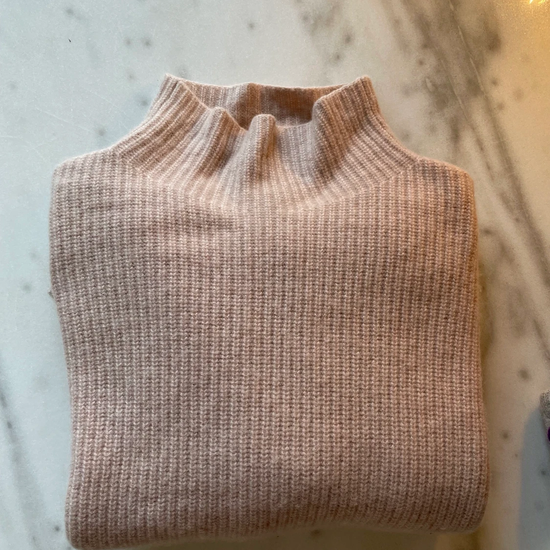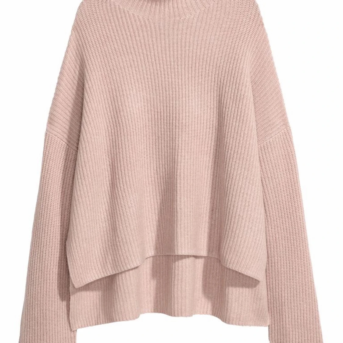 Ribbstickad Kashmirtröja från H&M trend, hög krage i puderrosa färg. Stl 34. Superfint skick!