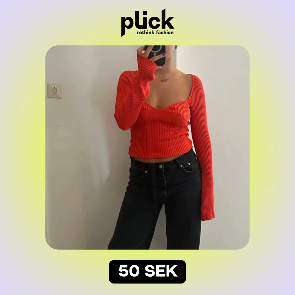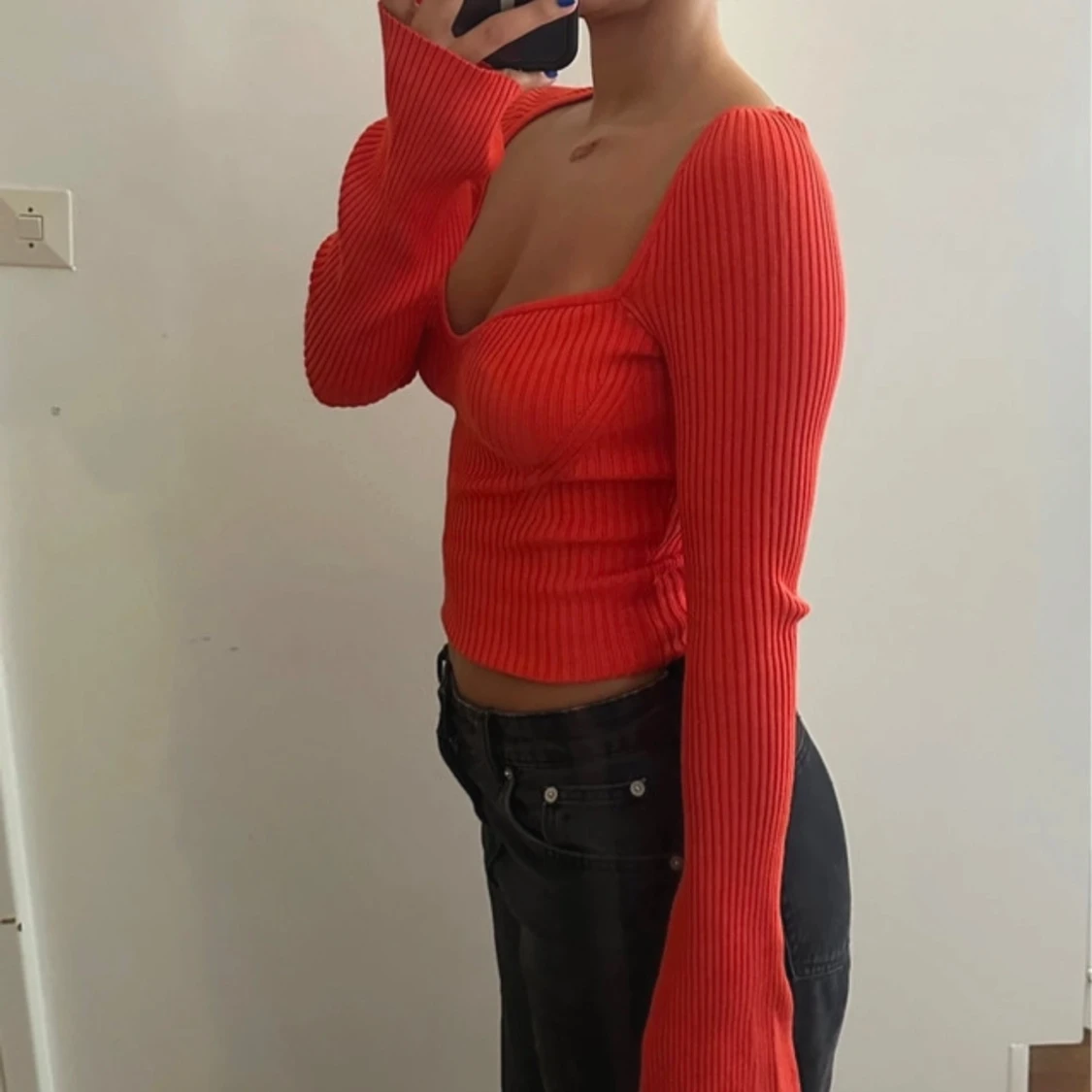 Säljer en superfin röd ribbad topp med långa ärmar och en snygg croppad passform. Perfekt för både vardag och fest! Toppen har en djupare urringning som ger en extra touch. Passar perfekt till jeans eller kjol.