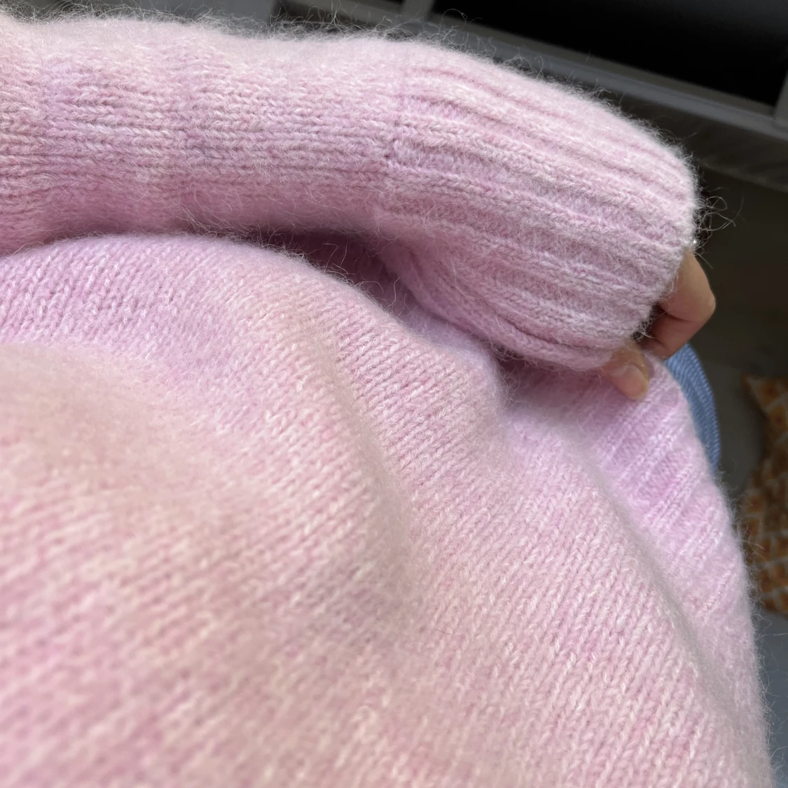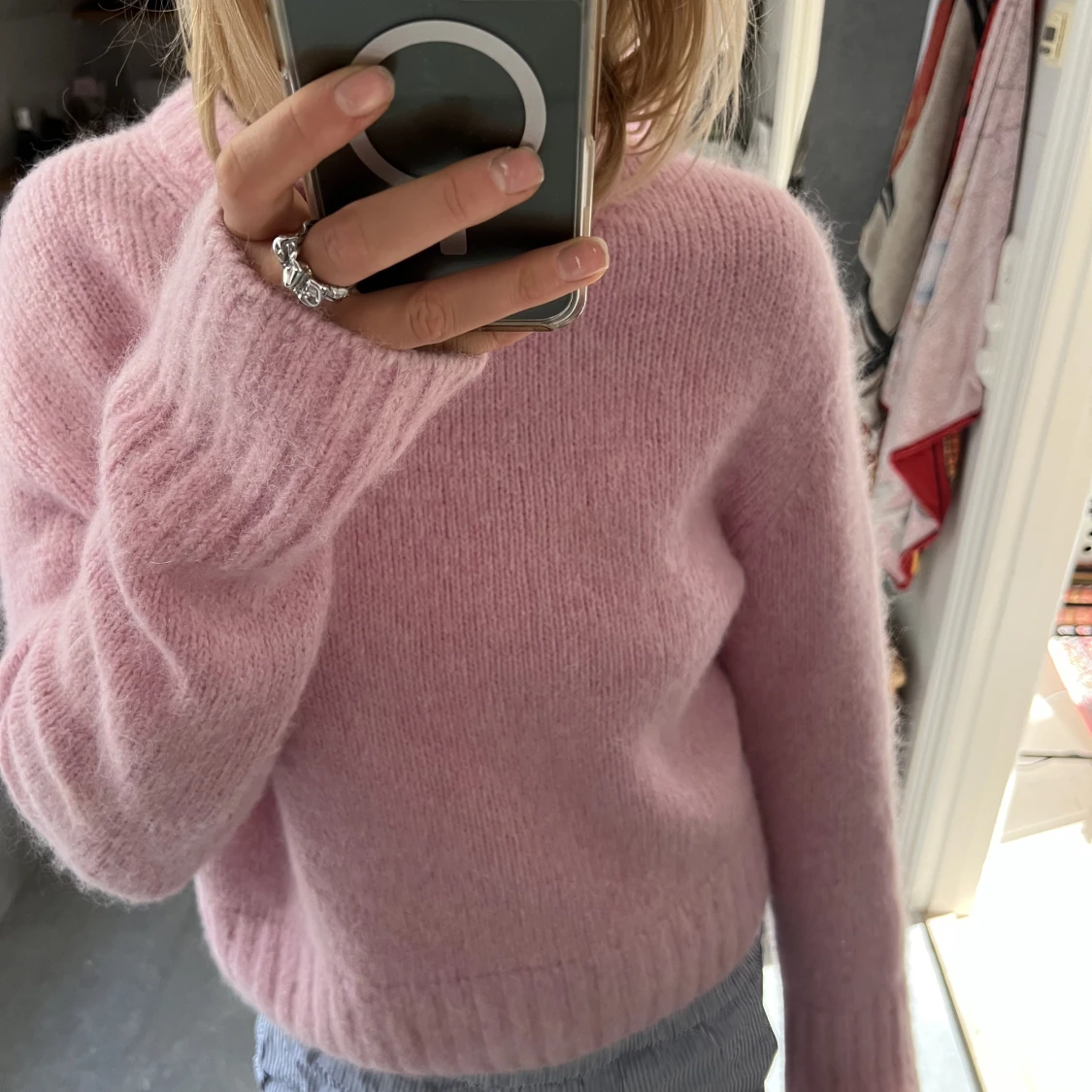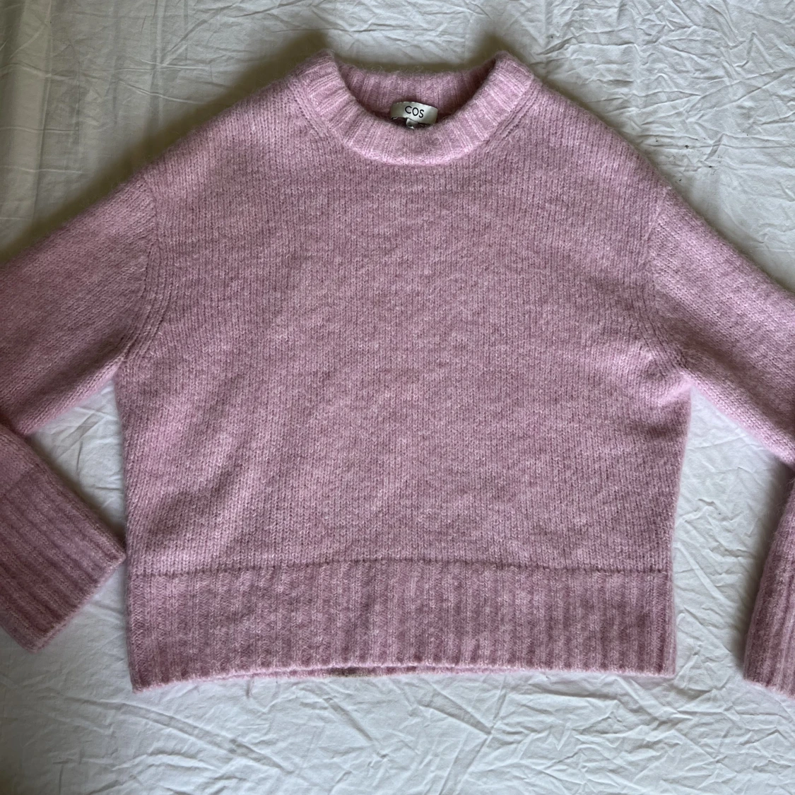 Stickad tröja från COS i alpacka-blandning med en så fin rosa färg. ÄLSKAR materialet på den här, tyvärr kommer den aldrig till användning. Den är LITE smutsig på baksidan längst ner, men det borde gå bort enkelt om man tvättar den. Fråga om bild.