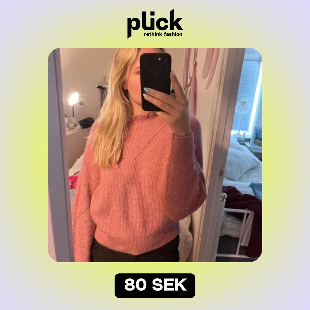 Rosa stickad tröja, lite högre i halsen. Den är mer rosa än vad som syns på bilden🌸