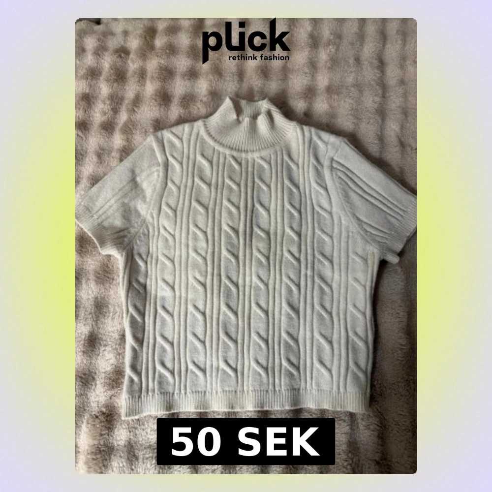 Kabelstickad topp i vitt med korta ärmar och hög ribbad krage. Tillverkad i en mjuk blandning av viskos, polyester och nylon. Snygg struktur med klassiskt mönster framtill och ribbade detaljer vid ärmslut och nederkant. Storlek S men ser ut som en XXS tröja på och utan.