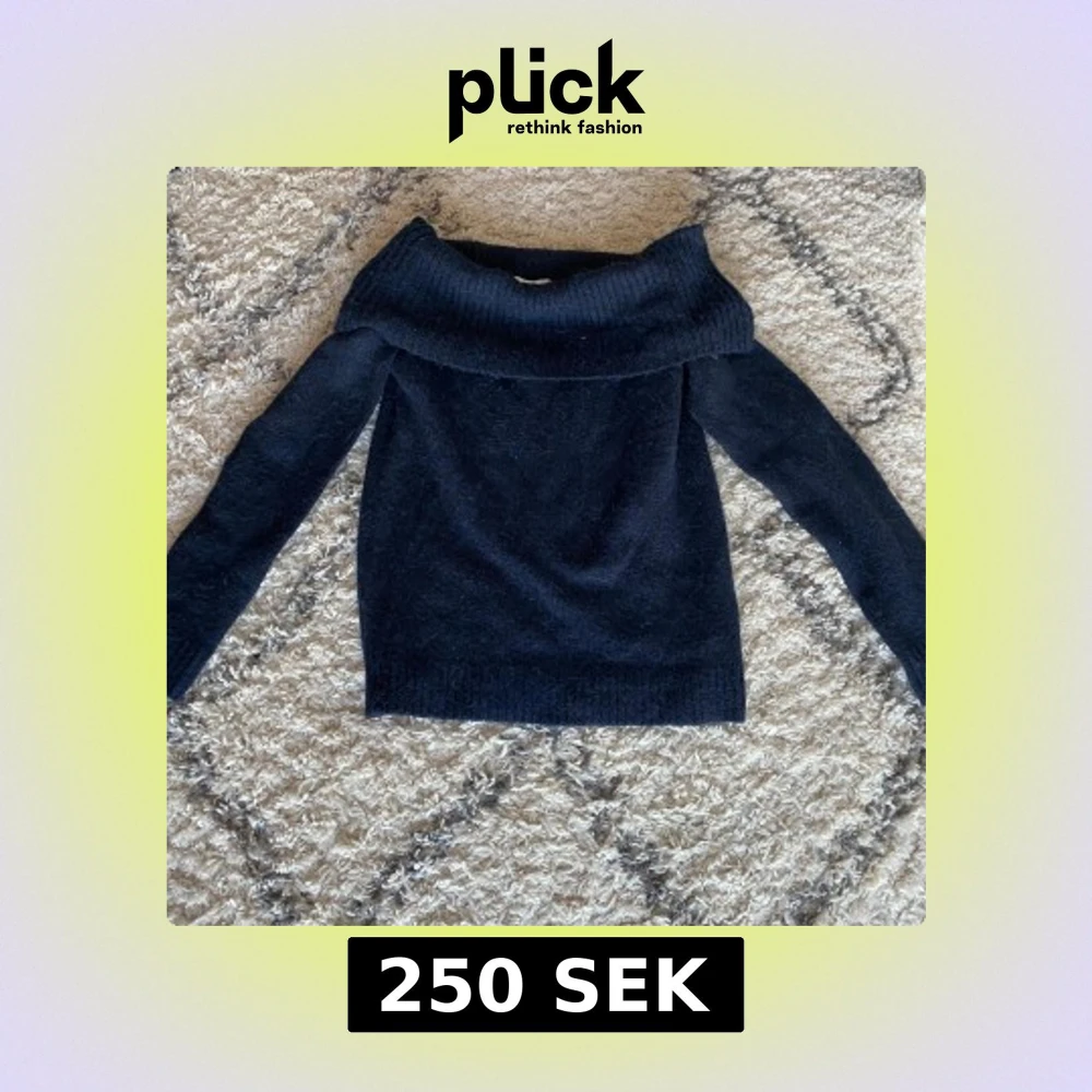 Mysig svart stickad tröja med bred offshoulder-krage. Tröjan har lång ärm och ribbade muddar vid ärmslut och nederkant.
