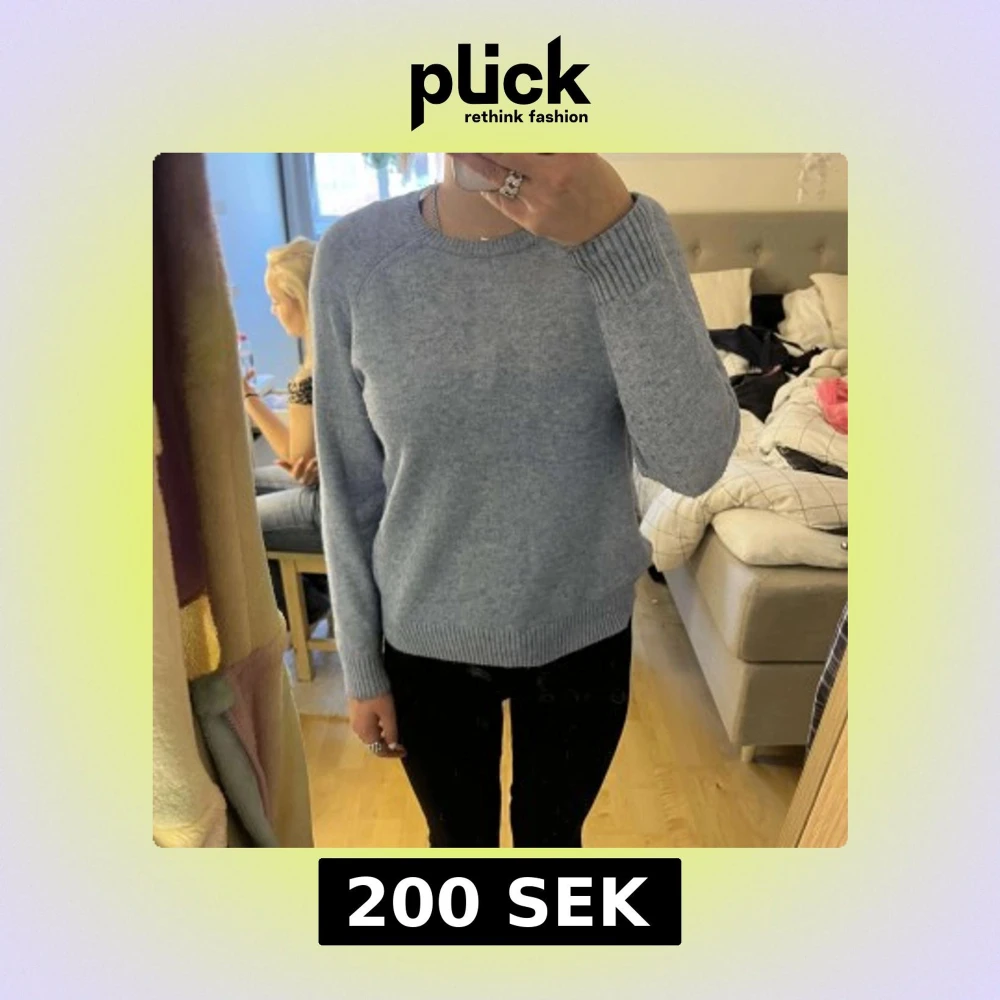 Säljer en ljusblå stickad tröja med rund hals och långa ärmar. Tröjan har ribbade muddar vid ärmslut och nederkant, vilket ger en klassisk look. Perfekt för kyligare dagar.