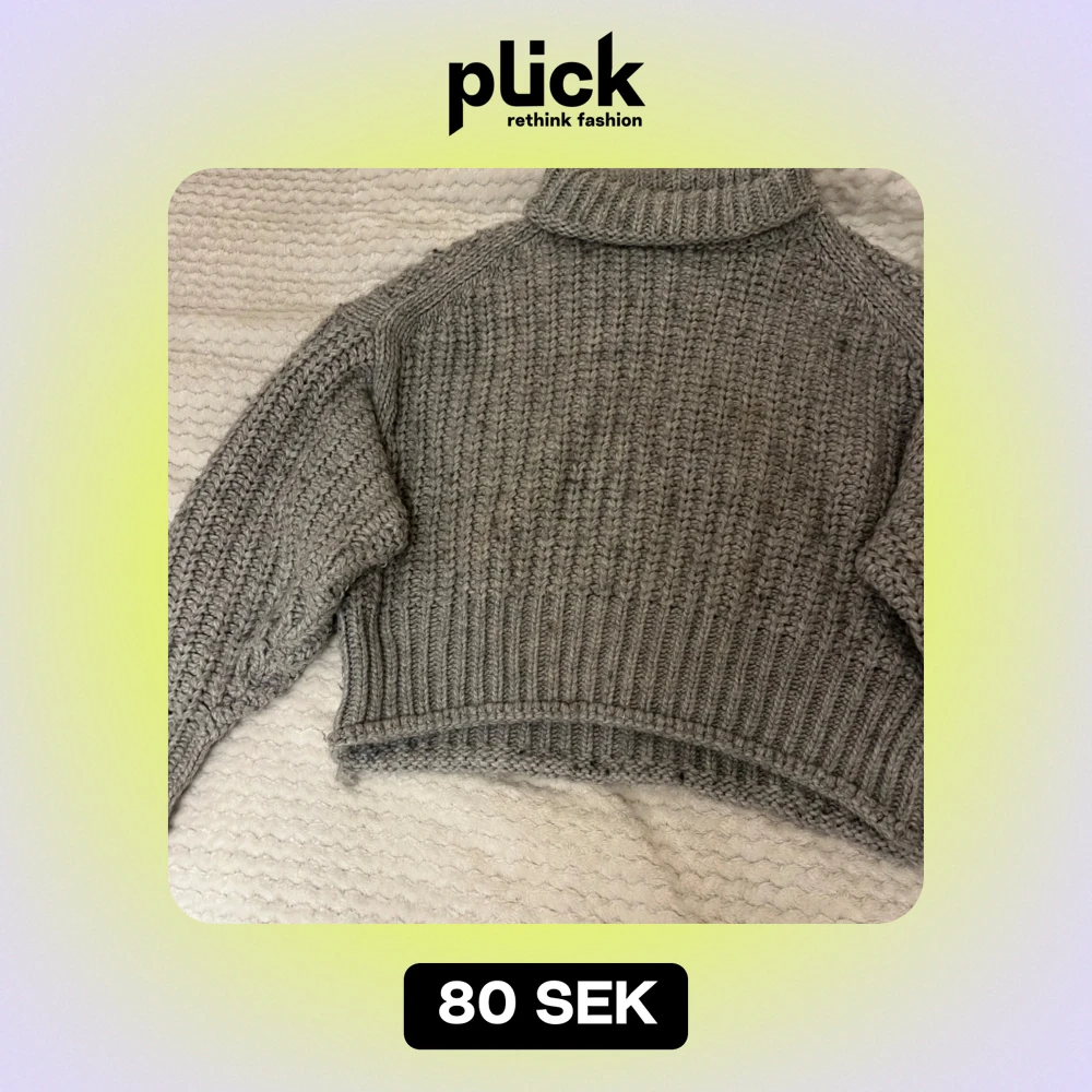 Säljer en supermysig grå stickad polotröja. Perfekt för kyliga dagar med sin croppade design och långa ärmar. Den har en ribbad struktur som ger en snygg look. Ett måste i garderoben för höst och vinter!