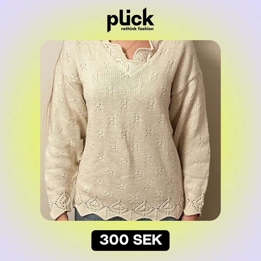 Säljer en superfin beige stickad tröja med v-ringning och spetsdetaljer vid halsen och nederkanten. Perfekt för höst och vår! Tröjan har långa ärmar och ett diskret mönster som ger den en unik touch.
