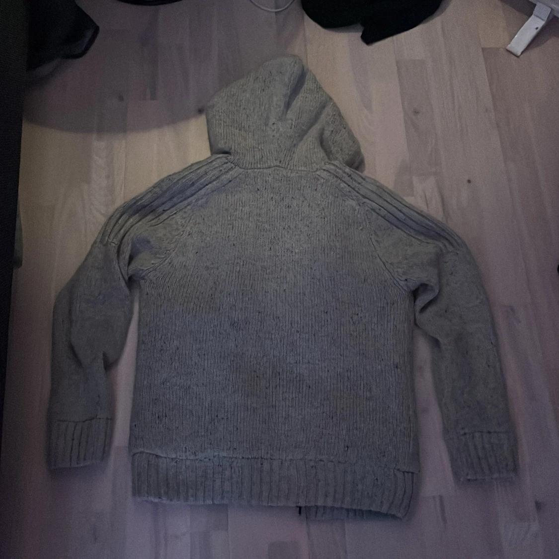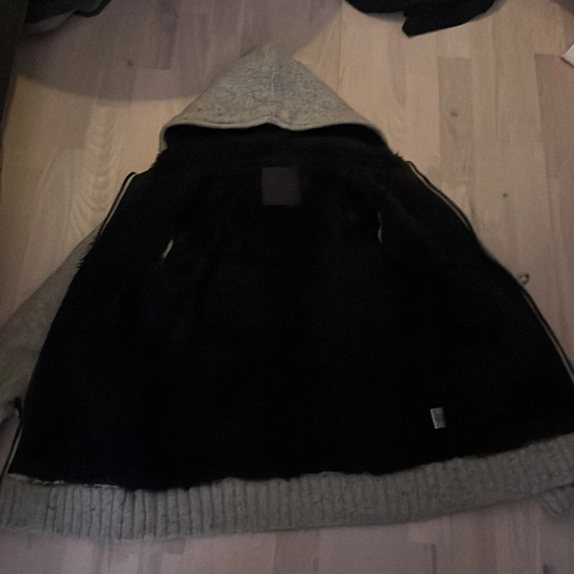 Säljer en grå stickad cardigan med huva och dragkedja. Jackan har ribbade muddar och två fickor med dragkedja framtill. Insidan är fodrad med ett mjukt material i päls för extra värme. Perfekt för kyliga dagar! True to size!