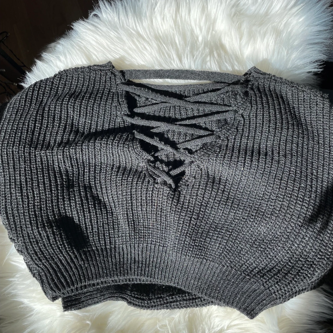 Mörkgrå tjocktröja från SHEIN. Jätte fin öppning i ryggen(bild 2). Aldrig använd och säljer endast för att den inte passar mig. Frakt tillkommer!
