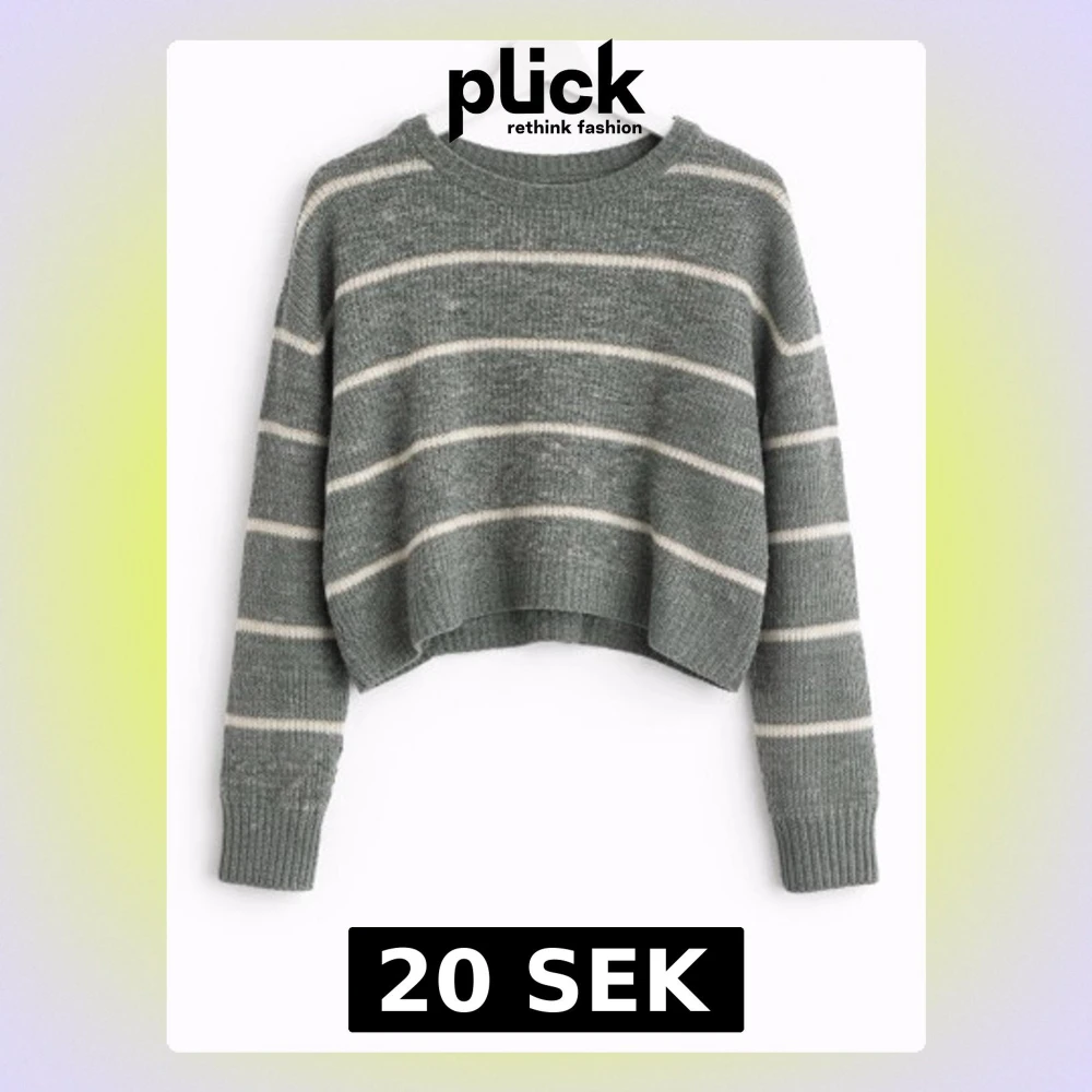 Mysig stickad tröja i grönt med vita horisontella ränder. Croppad modell med rund halsringning och långa ärmar. Materialet är 52% akryl, 27% polyamid, 11% polyester och 7% ull, vilket gör den både mjuk och stretchig.