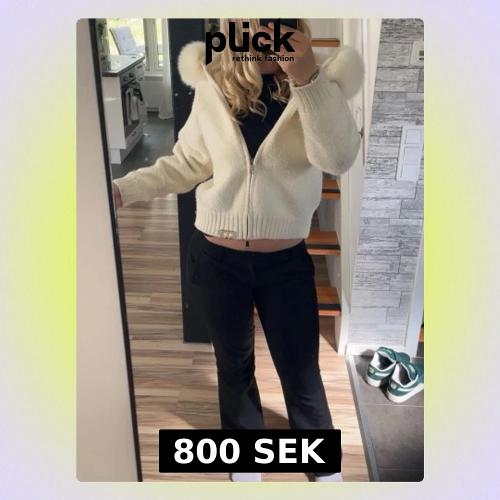 Säljer en vit stickad hoodie med dragkedja och fluffiga fuskpälsdetaljer på huvan. Tröjan har ribbstickade muddar och är tillverkad i mjukt material som ger en cozy känsla. Perfekt för dig som vill ha en trendig och varm look.