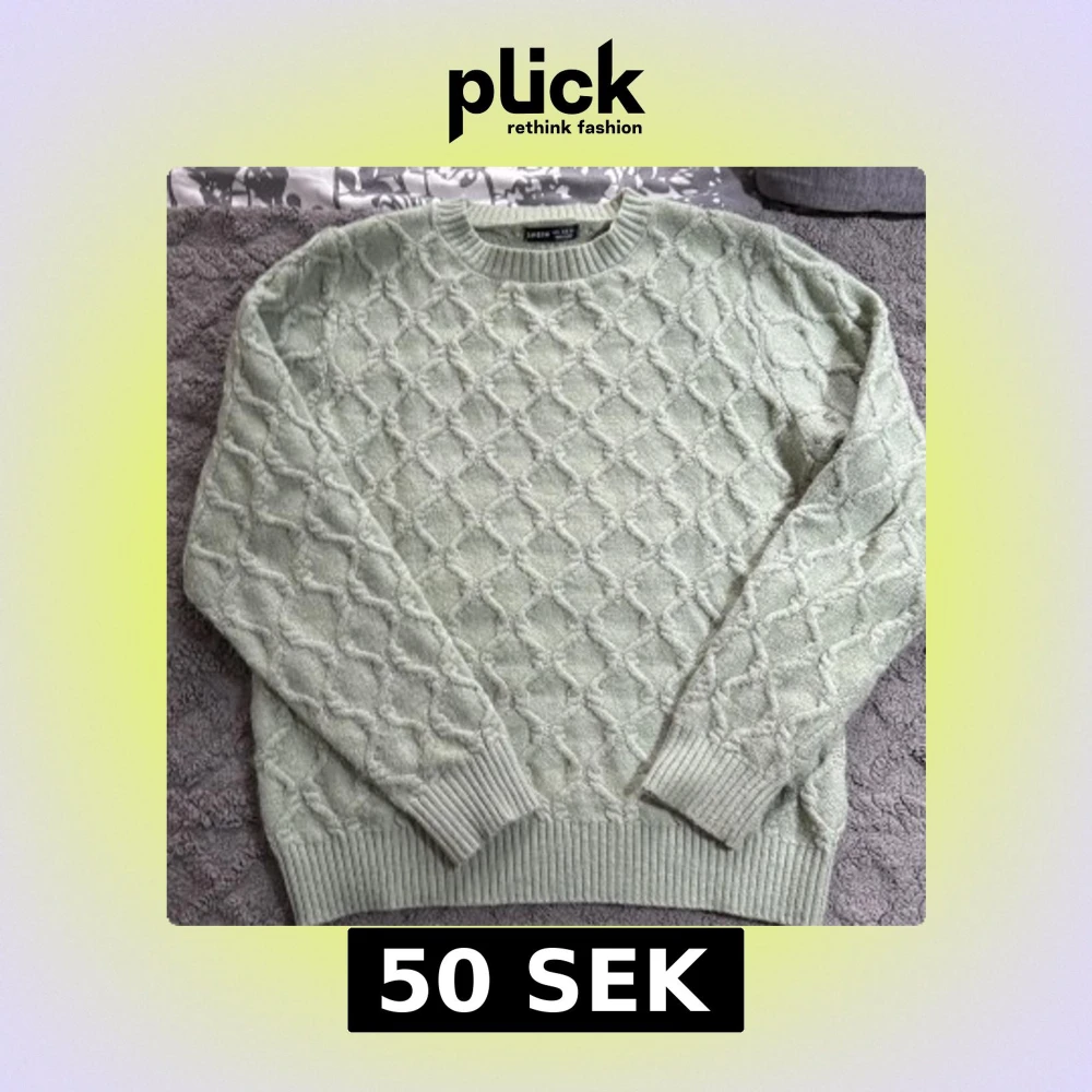 Supermysig ljusgrön stickad tröja från SHEIN i storlek S. Tröjan har ett snyggt kabelstickat mönster över hela och ribbade muddar vid ärmslut, hals och nederkant. Perfekt för lager-på-lager och chill dagar.