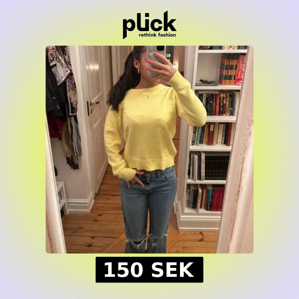 Snygg gul stickad tröja med rund hals och ribbade muddar vid ärmslut och nederkant. Modellen är normal i passningen och har långa ärmar. Verkligen super fin färg!