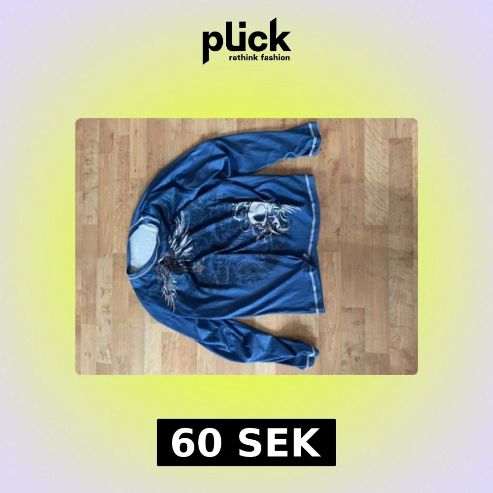 Cool blå tröja med stora tryck av dödskalle, vingar och kors både fram och bak. Tröjan har långa ärmar och vita detaljer längs muddar och nederkant. Perfekt för dig som gillar edgy och unika plagg.