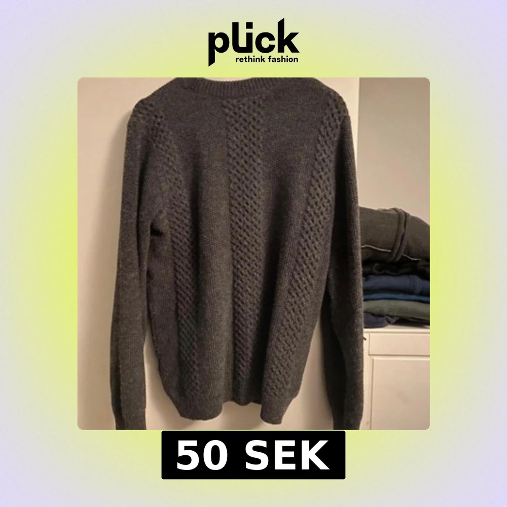 Säljer en mysig mörkgrå stickad tröja med ett diskret mönster. Tröjan har långa ärmar och en rund halsringning. Perfekt för kyliga dagar.