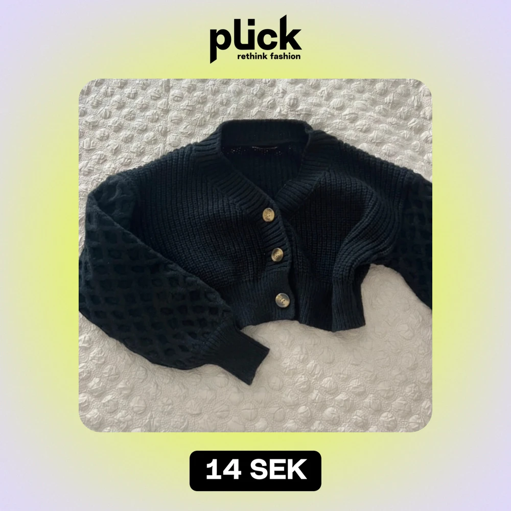Säljer en superfin svart stickad kofta med tre stora knappar framtill. Den har en mysig och varm känsla med ett unikt mönster på ärmarna. Perfekt för höst och vinter! 🖤helt ny. Passar som S.