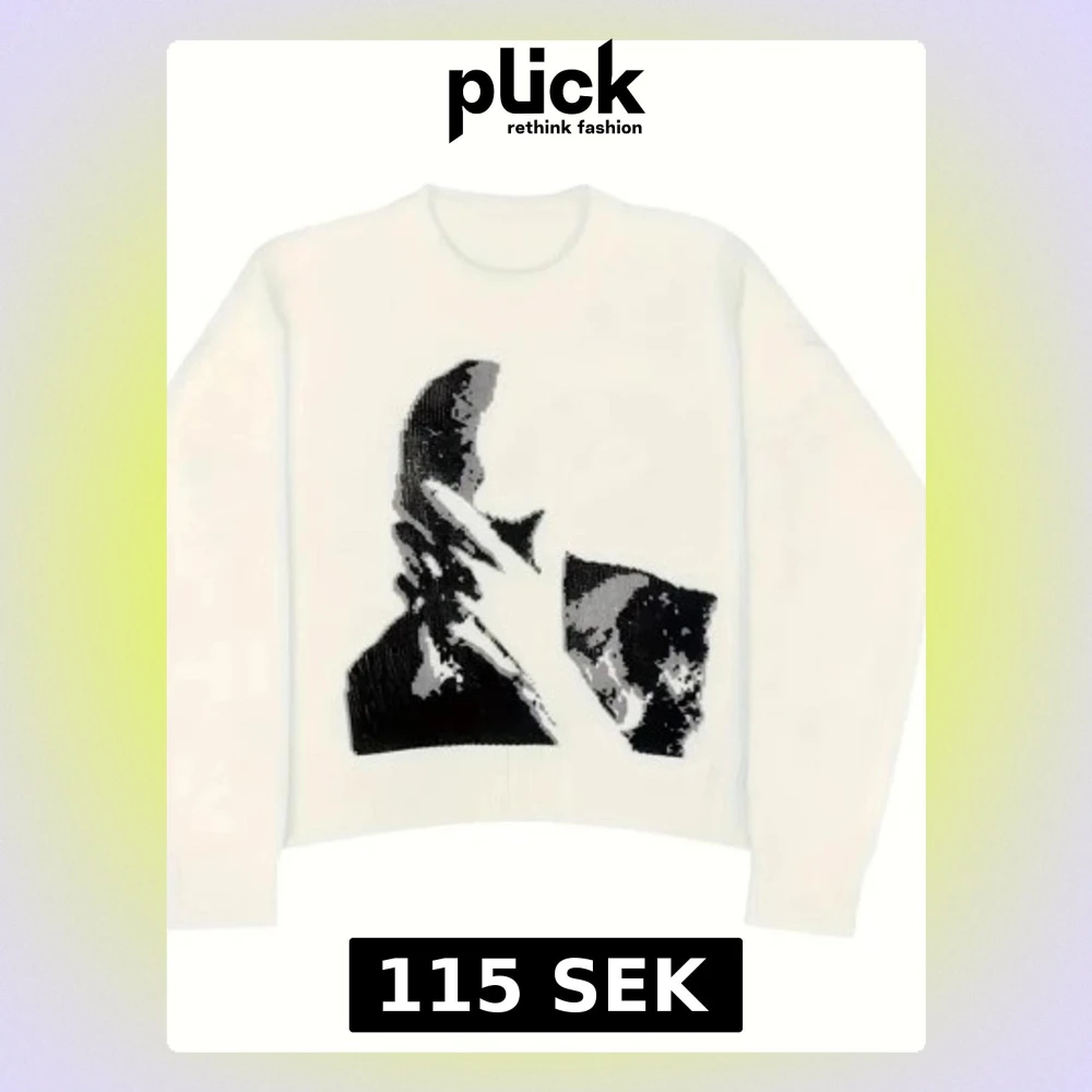 Vit stickad tröja med ett stort svart och grått grafiskt motiv framtill. Tröjan har rund halsringning och långa ärmar. Perfekt för dig som gillar unika och konstnärliga plagg med modern känsla. Öppen för förslag!