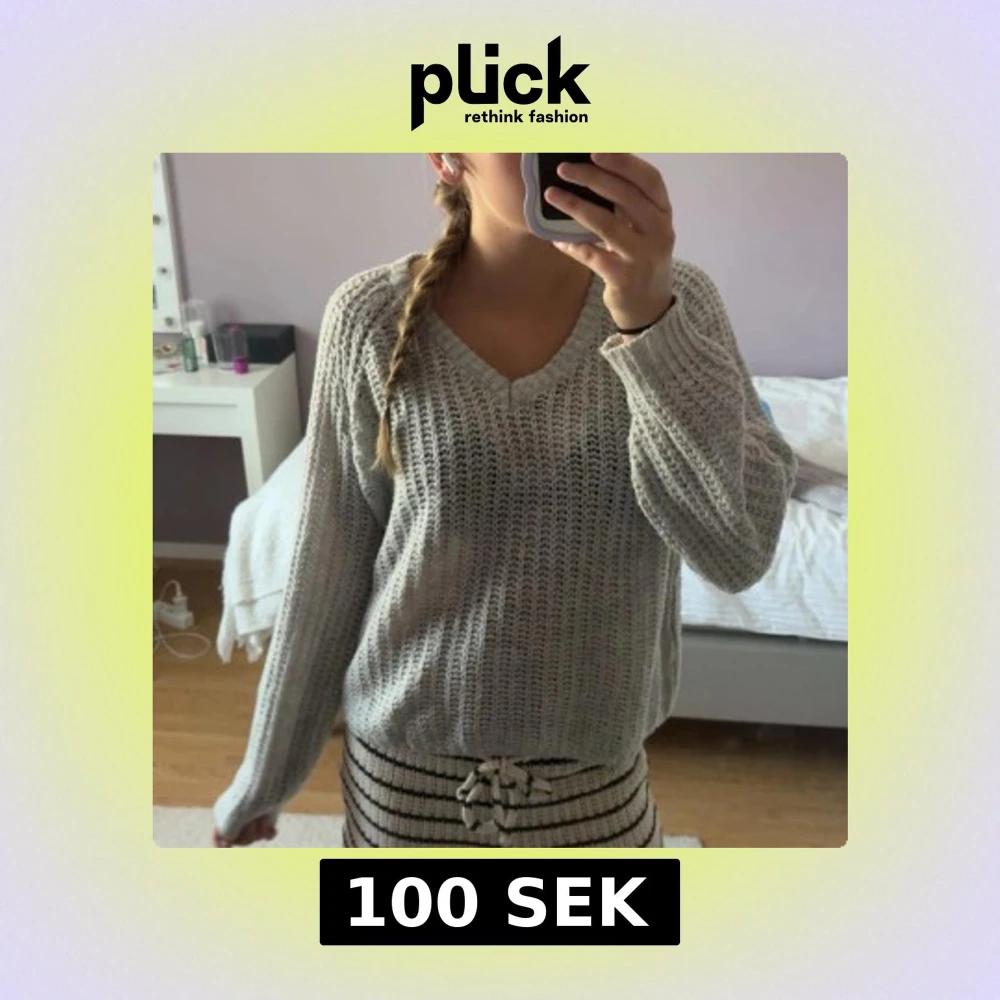 Säljer en chill grå stickad tröja med v-ringad hals. Tröjan har en loose passform och långa ärmar, perfekt för att mysa i under kyliga dagar. Enkel och stilren design som funkar till det mesta. Fråga gärna om du vill veta mer om storlek!