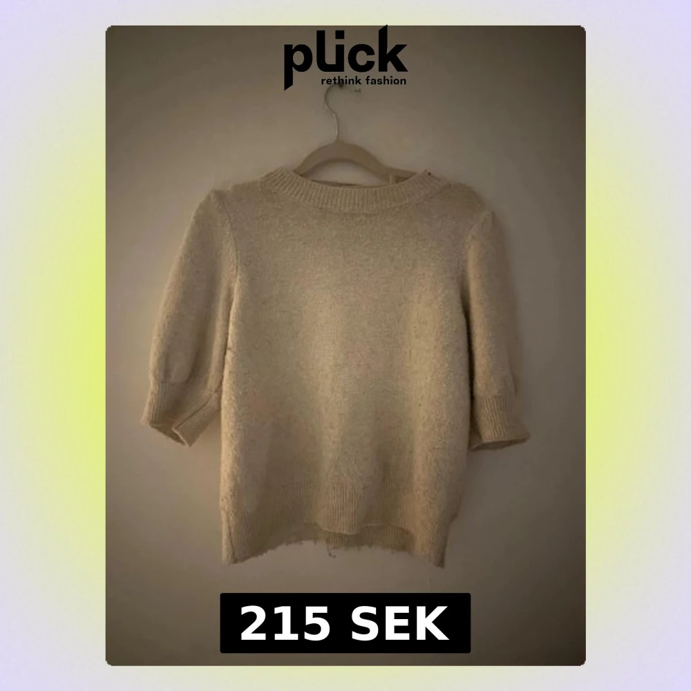 Mysig beige stickad trekvart tröja med korta puffärmar och ribbstickade muddar vid ärmslut och nederkant. Tröjan har lite noppring men inga hål eller fläckar💕