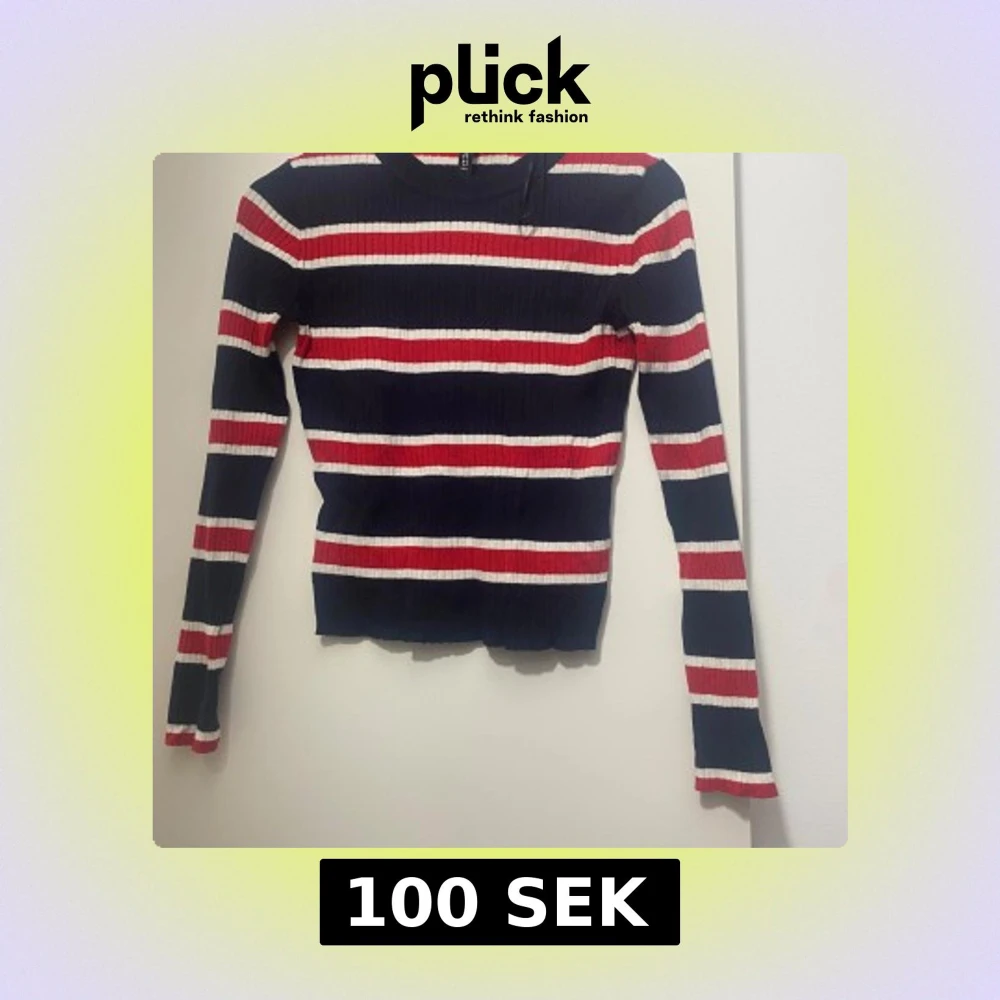 Randig långärmad tröja från H&M Divided i marinblått, rött och vitt. Tröjan är ribbstickad med smal passform och har klassisk rund hals. Perfekt för dig som gillar en sportig och färgglad stil.