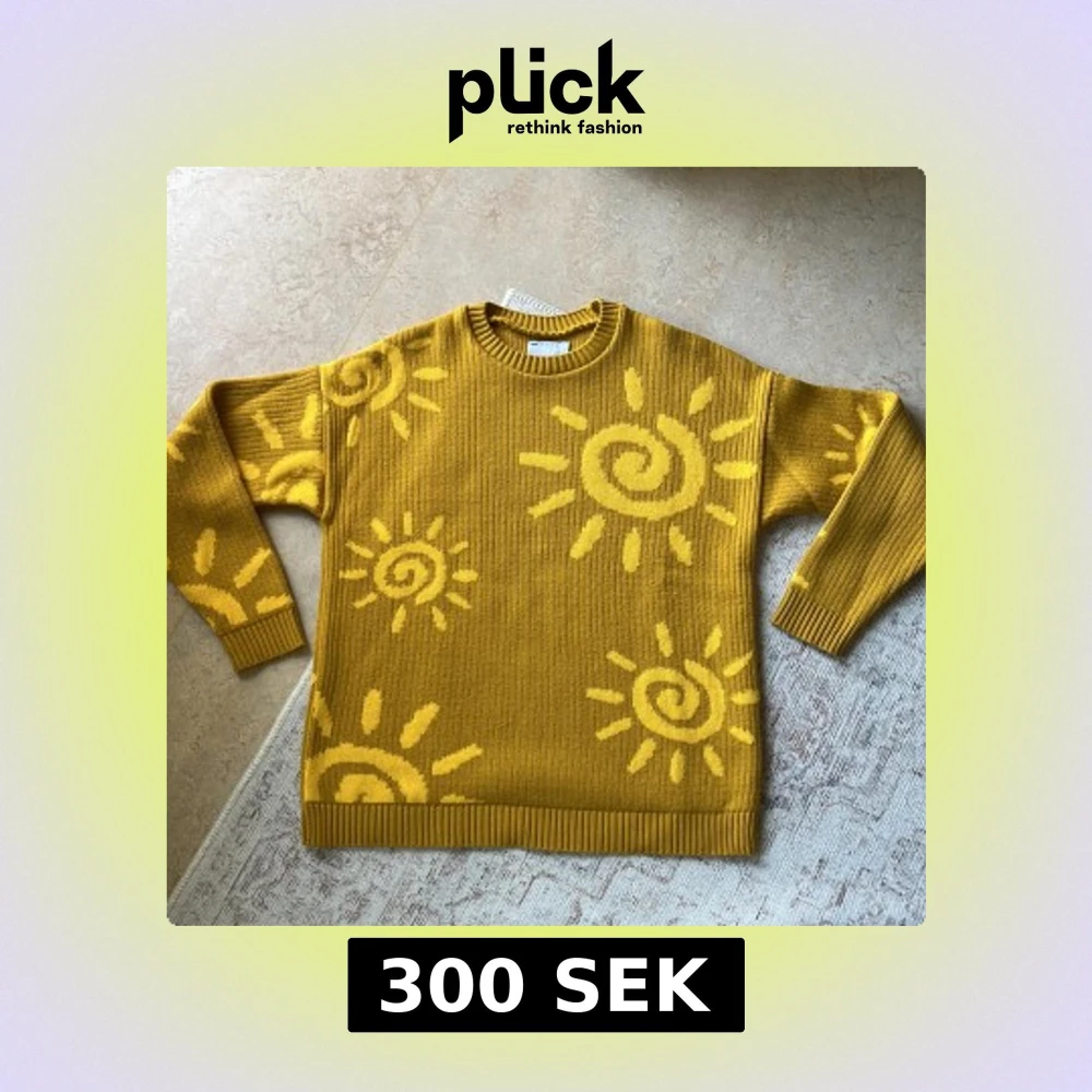 Gul stickad tröja från ASOS DESIGN med solmönster i en ljusare gul nyans. Tröjan har ribbade muddar och rund hals, samt långärmad och oversized passform. Använd fåtal gånger och i fint skick